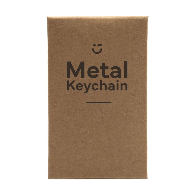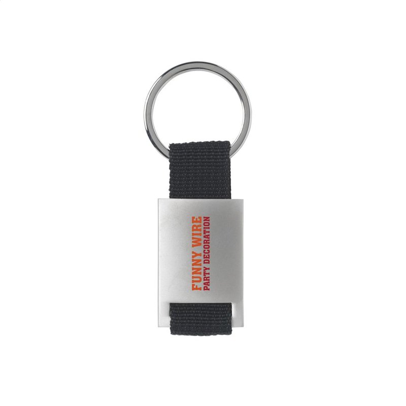 Matmetalen sleutelhanger gecombineerd met sterk geweven nylon aan stevige sleutelring. Per stuk in doosje.