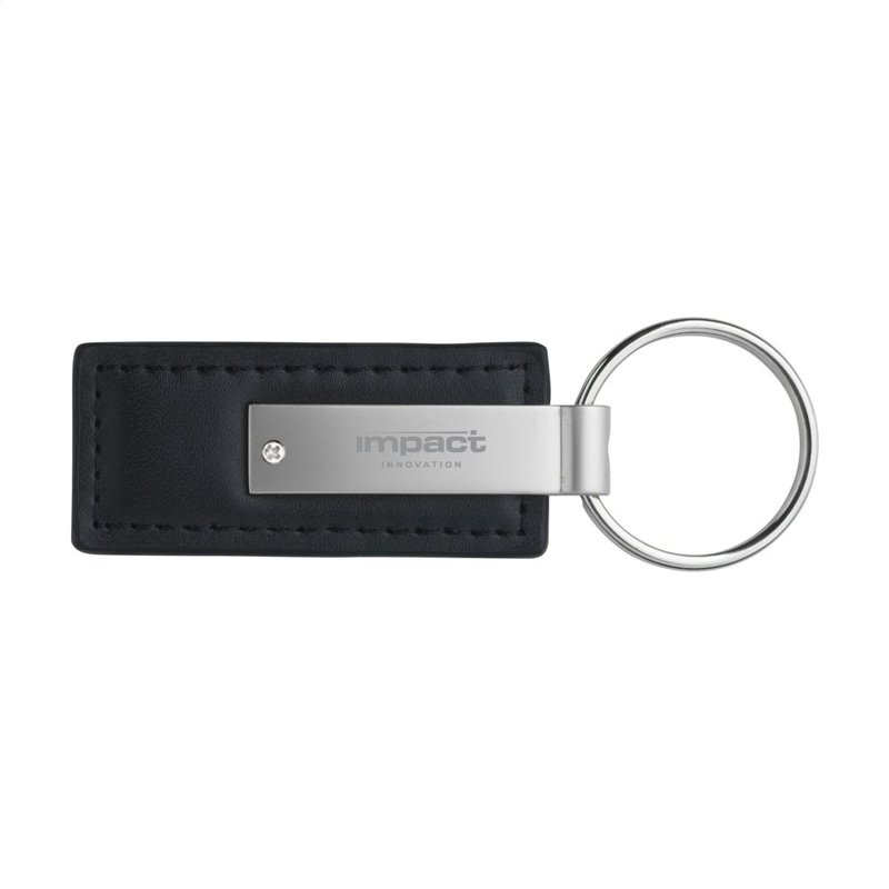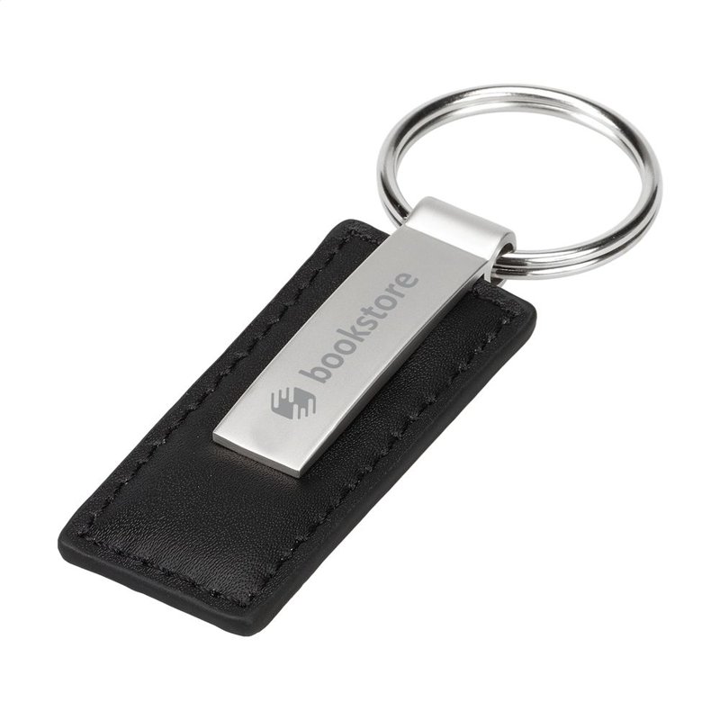 Matmetalen/imitatieleren sleutelhanger met stevige sleutelring. Per stuk in doosje.