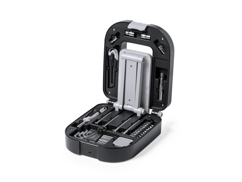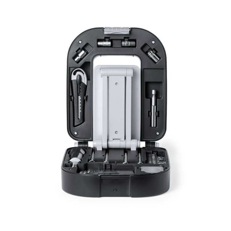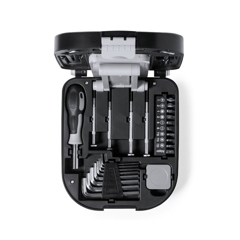 Originele gereedschapsset met licht en 30 accessoires. Gepresenteerd in een duurzame zwarte ABS-doos met sluiting. Opvouwbare lamp geïntegreerd in de doos, met 24 LEDs en AAN / UIT-knop. Inclusief schroevendraaier met veel platte, philips, torx tips; precisie schroevendraaier kit; buissleutels; inbussleutels in verschillende maten; snijder en 1m flexometer. Lamp op batterijen (3xAA niet inbegrepen). Gepresenteerd in een individuele doos met kraft design. 24 Leds. Lamp met Instelbare Lichtintensiteit. 30 Accessoires. 3 Batterijen AA Niet Inclusief Gereedschaps Set Teigel 1530