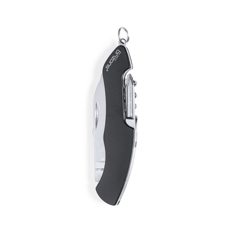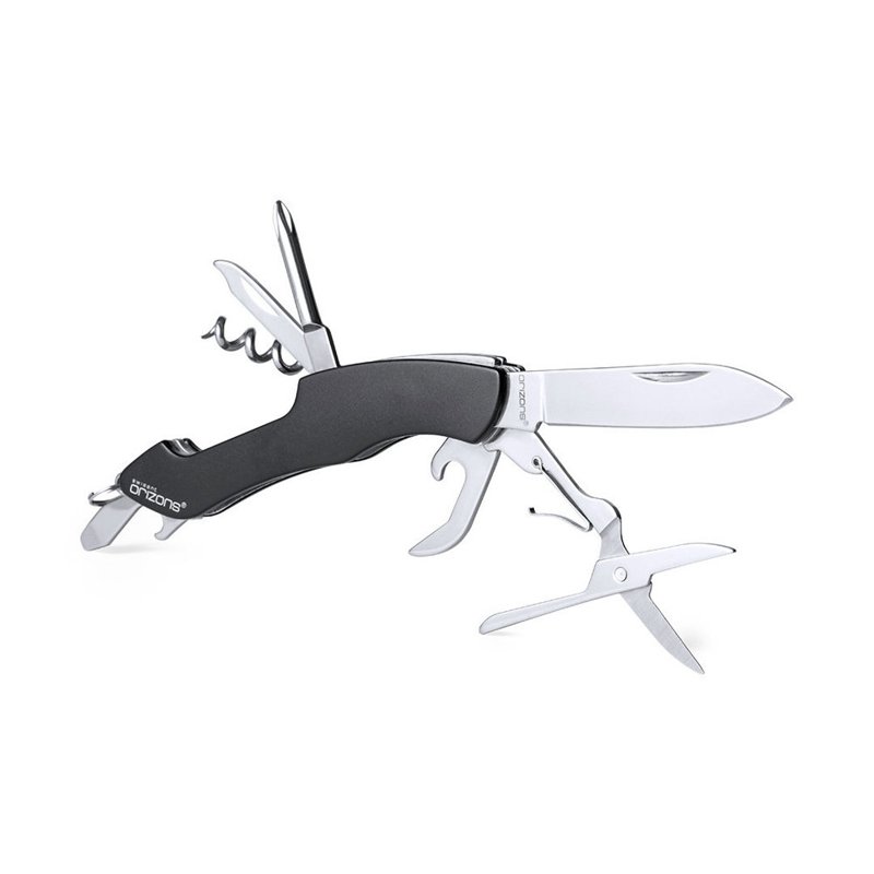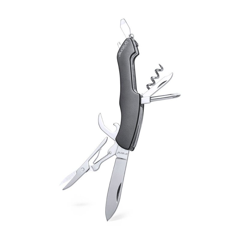Multifunctioneel mes met roestvrij stalen accessoires met 10 functies en aluminium handvat in diverse kleuren. Met mes, schaar, blikopener, flesopener met platte schroevendraaier, kruiskopschroevendraaier, vijl en kurkentrekker. Met ring voor sleutelhanger en gepresenteerd in een aantrekkelijke designdoos met het merklogo.