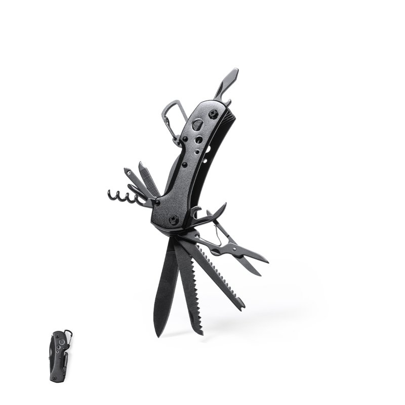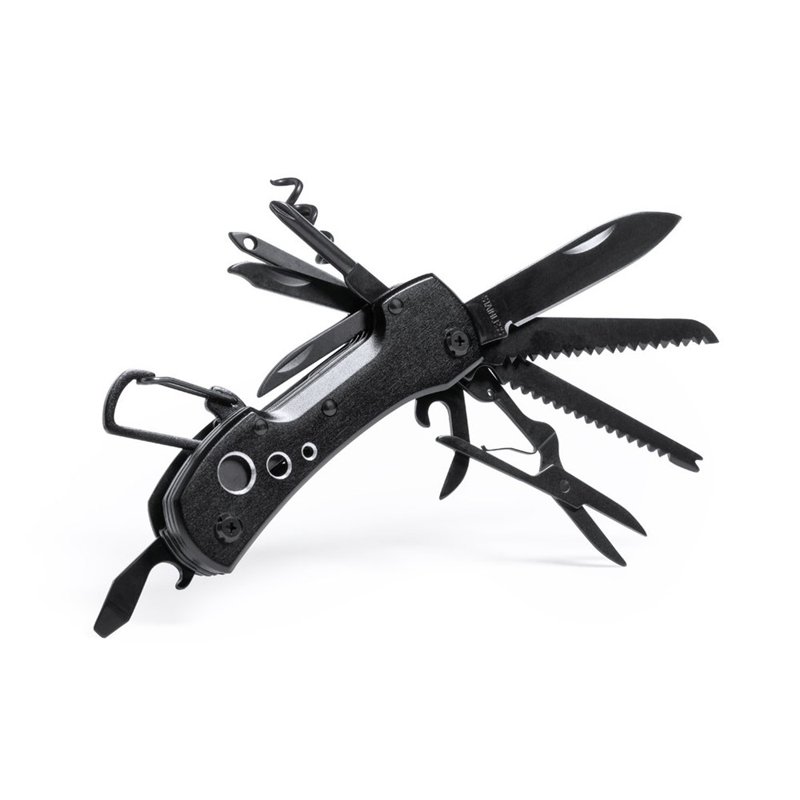 Multifunctioneel mes met accessoires in roestvrij staal met zwarte afwerking. Bijpassende stevige aluminium handgreep met geïntegreerde karabijnhaak. 13 functies, waaronder mes, schroevendraaier, vijl, opener en schaar. Opvouwbaar en compact van formaat, gepresenteerd in een individuele doos in zwart design. 13 Functies Multifunctioneel Zakmes Komit 1590