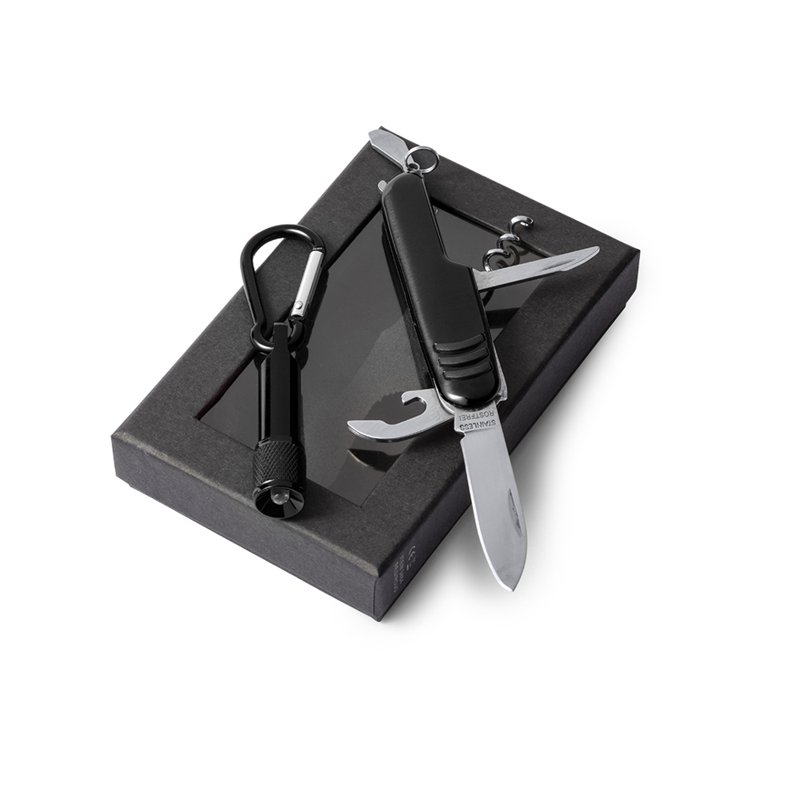 Set van aluminium mes met 7 functies en karabijnhaak. In gevarieerde kleuren en gepresenteerd in een doos met venster en zacht schuim aan de binnenkant. Knoopcelbatterijen inbegrepen.