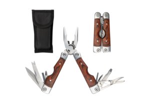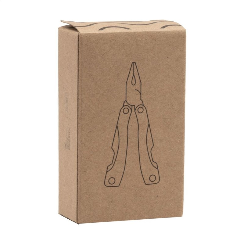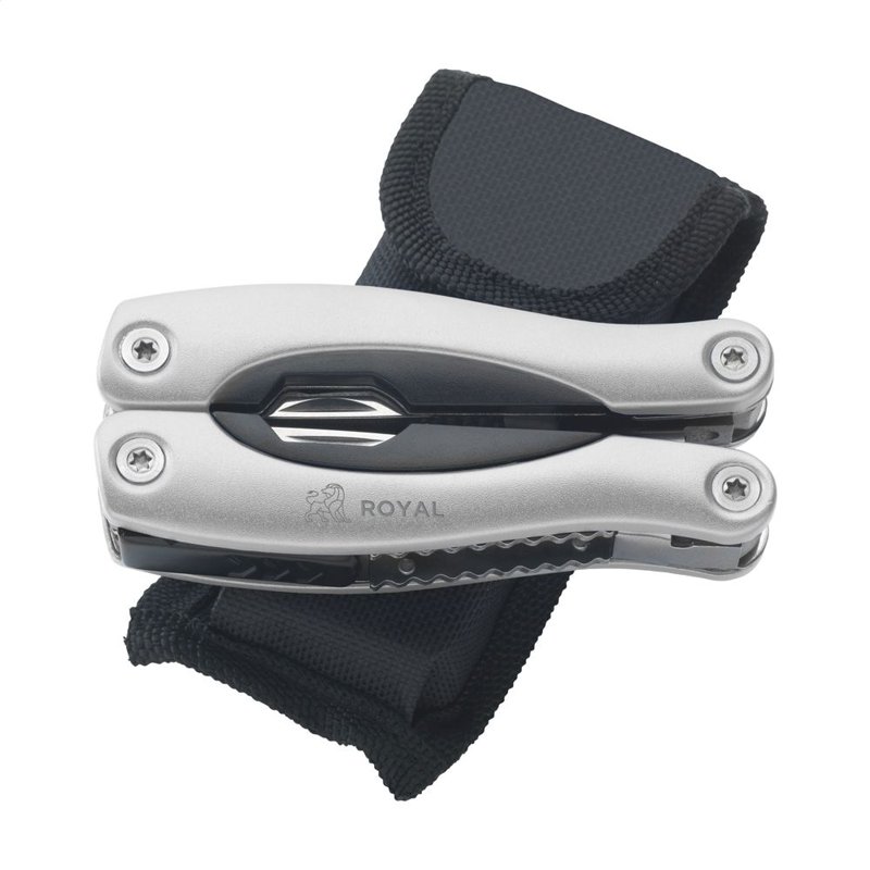 Compacte RVS multitang met aluminium handgreep in metallic look. 9-delig met 13 functies: tang, draadknipper, 3 schroevendraaiers, philips kruiskopschroevendraaier, vijl, zaag/visschraper, mes, priem, blikopener, flesopener. In 600D nylon etui. Op het bezit en/of dragen van messen of multitools in het openbaar kunnen lokale regels van toepassing zijn. Per stuk in doosje.