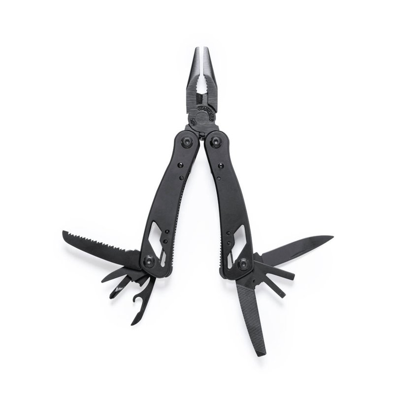 Multitool met accessoires in RVS met zwarte finish, en bijpassende resistente aluminium handgreep. Met 12 functies, waaronder mes, schroevendraaier, vijl, opener en tang. Opvouwbaar en compact van formaat, gepresenteerd in een individuele doos in zwart design. 13 Functies Multitool Dailfot 1589