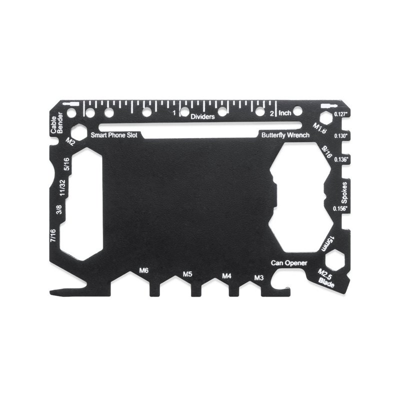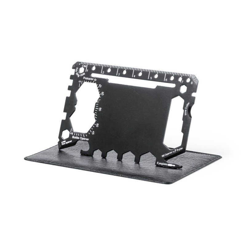 Multitool met robuuste behuizing in RVS en 17 functies. Onder andere: blikopener, mes, schroevendraaier, liniaal, flesopener, moersleutel, vlindersleutel en gradenboog. 17 Functies. PU Zakje Multitool Frest 1592