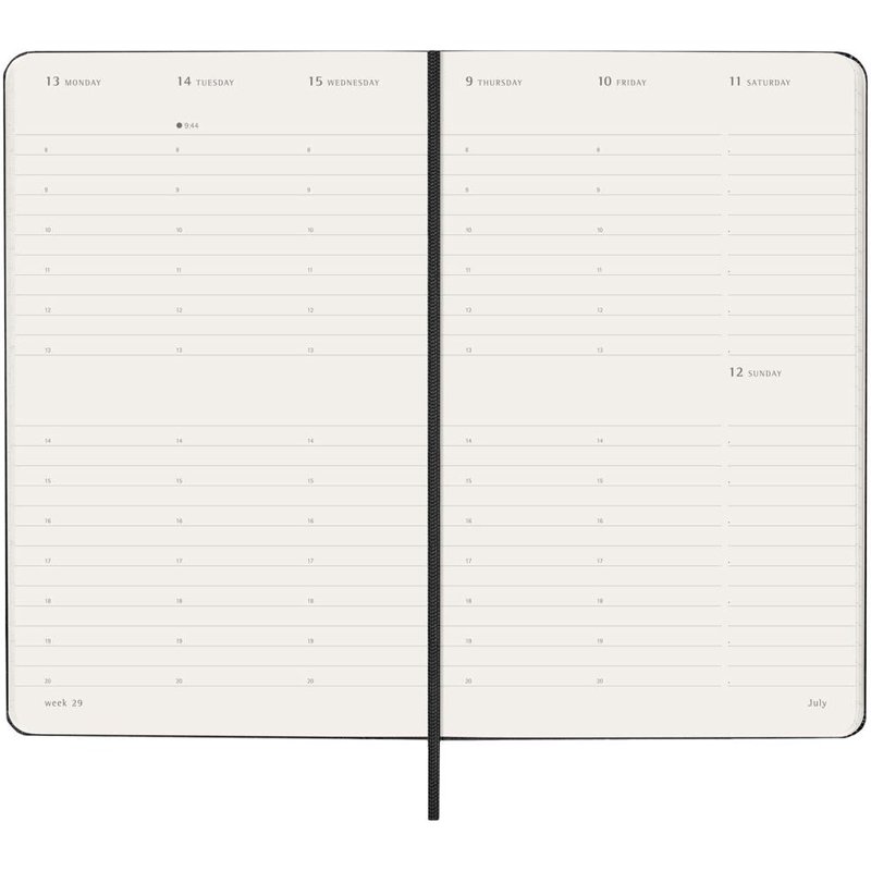 De Moleskine L week-agenda verticaal met harde kaft loopt van januari tot december 202. Deze populaire planner-stijl, opgemaakt in een verticaal formaat om elke week op twee pagina's weer te geven, waarbij de dagen bovenaan de pagina staan, is perfect voor degenen die een overzicht willen hebben van de georganiseerde week. Met ivoorkleurig zuurvrij papier, een zwarte elastische sluiting, een paginalintmarkering, een kleurgecoördineerde uitklapbare binnenzak en stickers voor het personaliseren van je agenda, evenals jaarstickers voor de rug.
