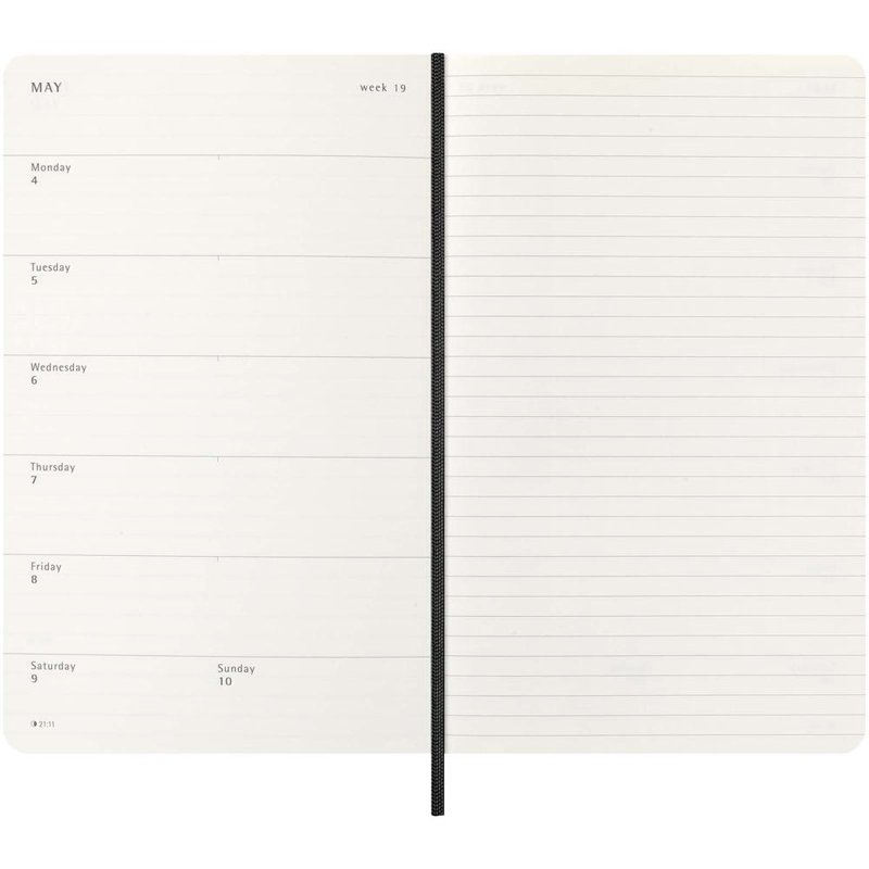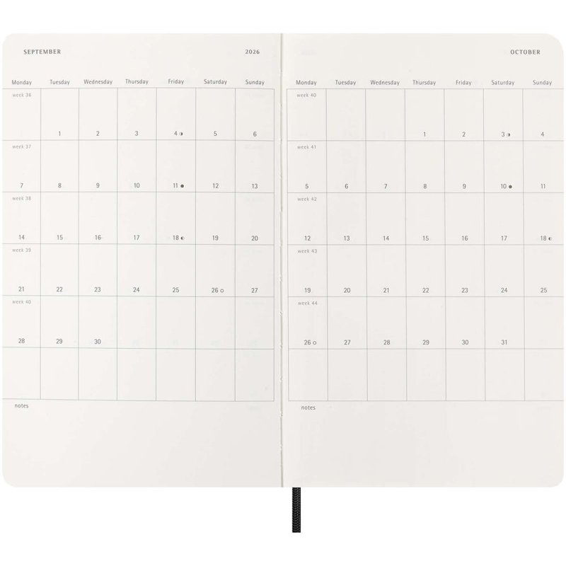 De Moleskine 12-maanden week-agenda met zachte kaft, gedateerd van januari tot december 2026, geeft de hele week in één oogopslag weer en biedt ook jaarlijkse en maandelijkse momentopnamepagina's voor een breder overzicht van het jaar, gevolgd door pagina's voor reisplanning, ideeën en doelen. De dagen van elke week worden aan de ene kant weergegeven tegenover een gelinieerde pagina voor taken en notities. Met ivoorkleurig zuurvrij papier, een zwarte elastische sluiting, een paginalintmarkering, een kleurgecoördineerde uitklapbare binnenzak en stickers voor het personaliseren van je agenda, evenals jaarstickers voor de rug.