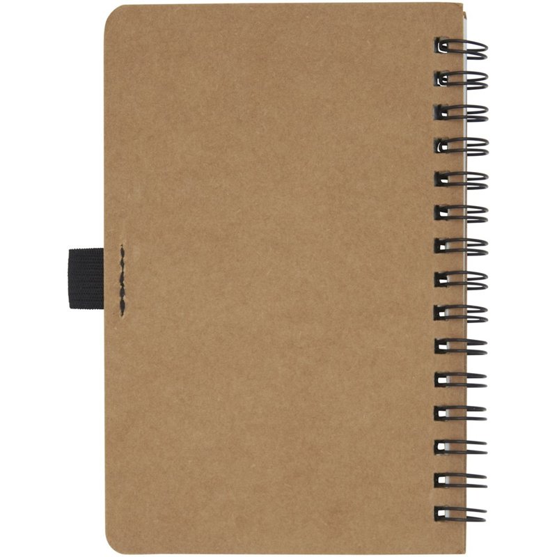 Wire-o-notitieboek in A6-formaat met cover uit gerecycled karton en penlus. Bevat 70 vellen 60 g/m² gelijnde binnenpagina's gemaakt van steen. Steenpapier is 100% boomvrij en het productieproces verbruikt minder energie in vergelijking met gerecycled of nieuw pulppapier. Het papier is water- en scheurbestendig en heeft een natuurlijke witte kleur (er is geen bleekmiddel gebruikt).