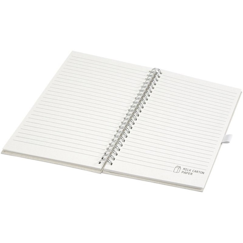 A5-formaat spiraal notitieboek met 70 gelinieerde vellen van 80 g/m², gemaakt van gerecyclede melkpakken (tot 70%). Gebruikte melkpakken worden ingezameld, gesorteerd, verwerkt en omgezet in papier, waardoor afval echt iets nuttigs wordt.