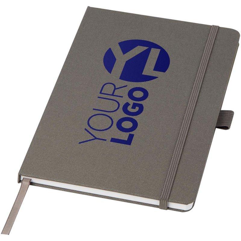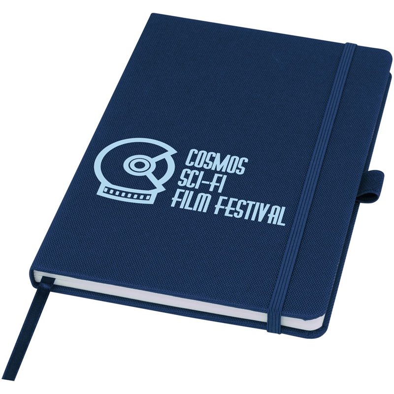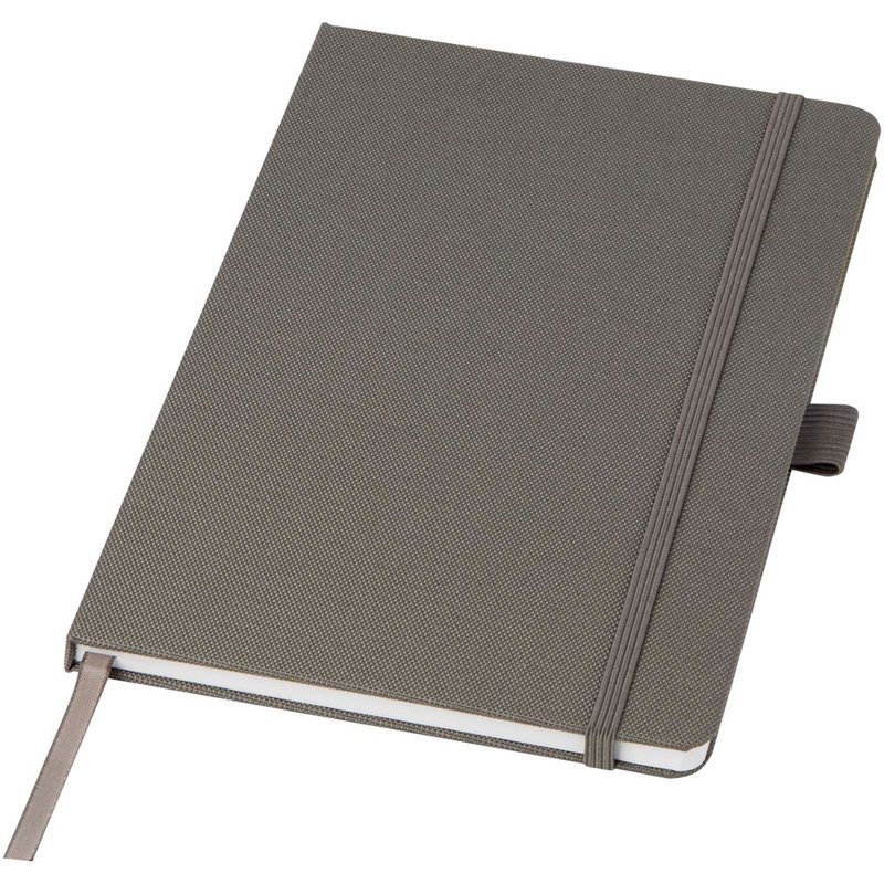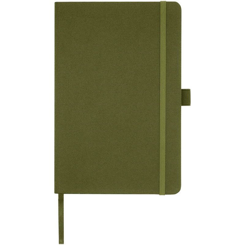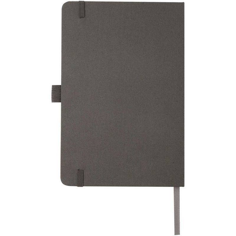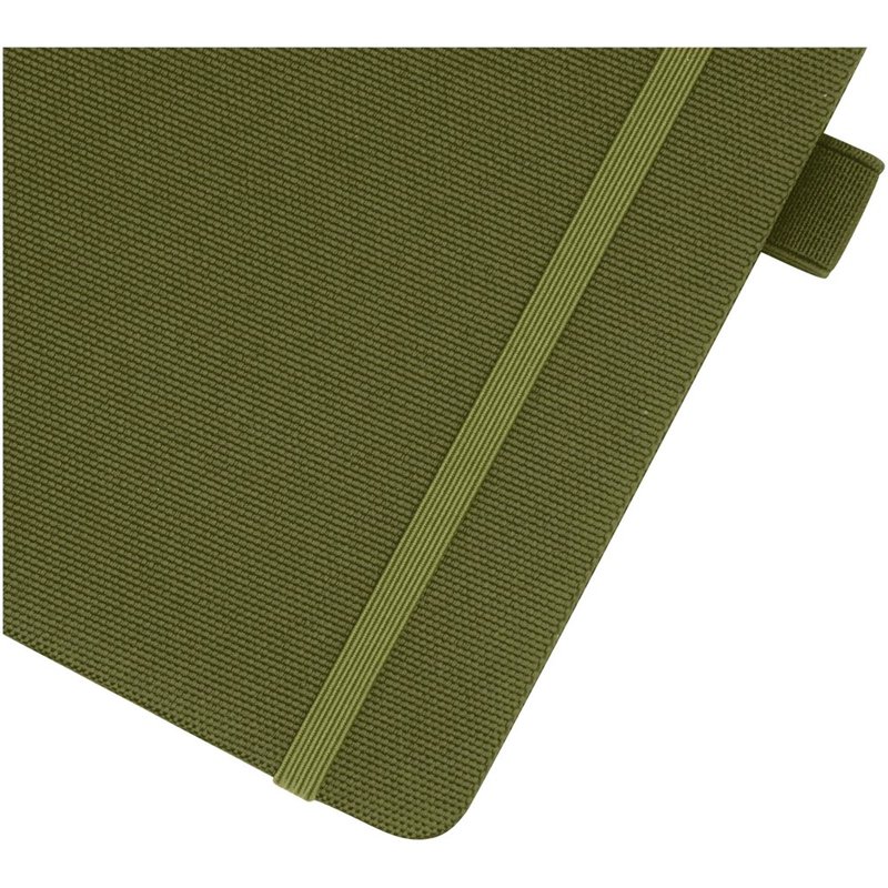 Notitieboek in A5-formaat met cover van RPET-stof. Bevat 80 vellen 70 g/m² gerecycled papier met gelijnde lay-out, een pennenlus en lint. Te combineren met de 107757 Honua RPET-balpen.