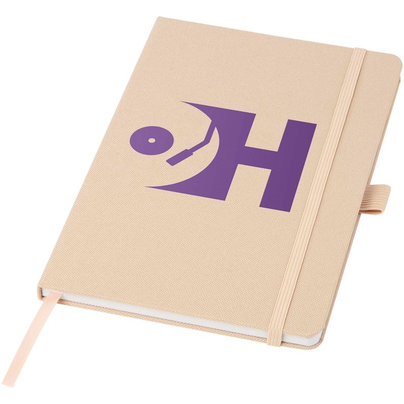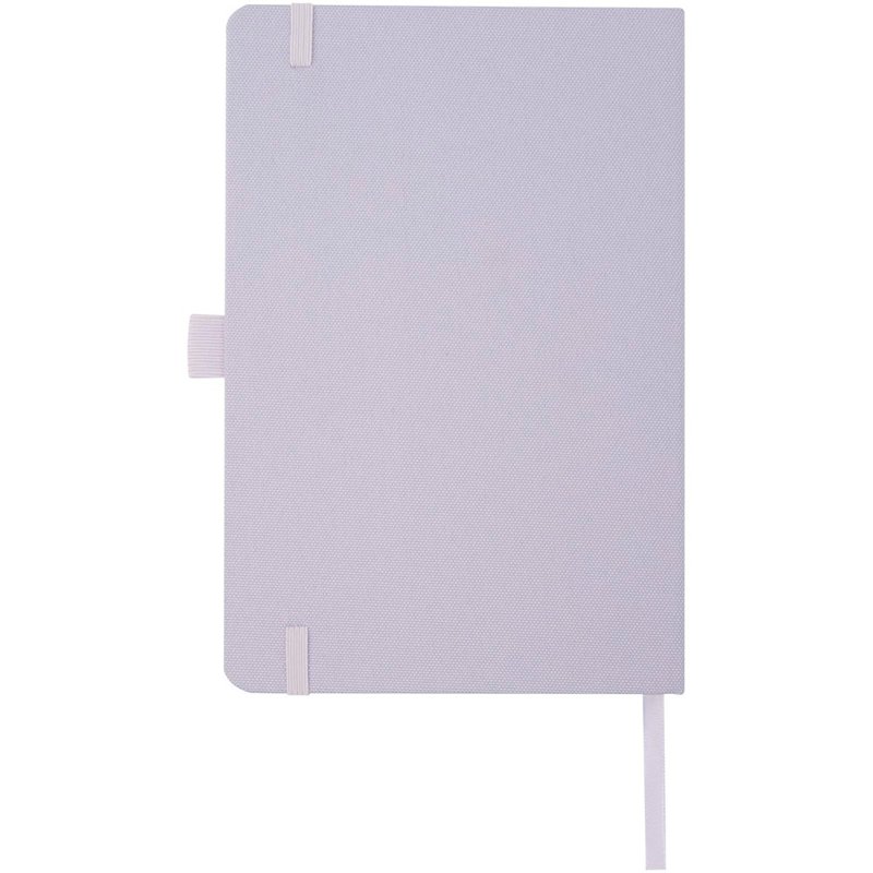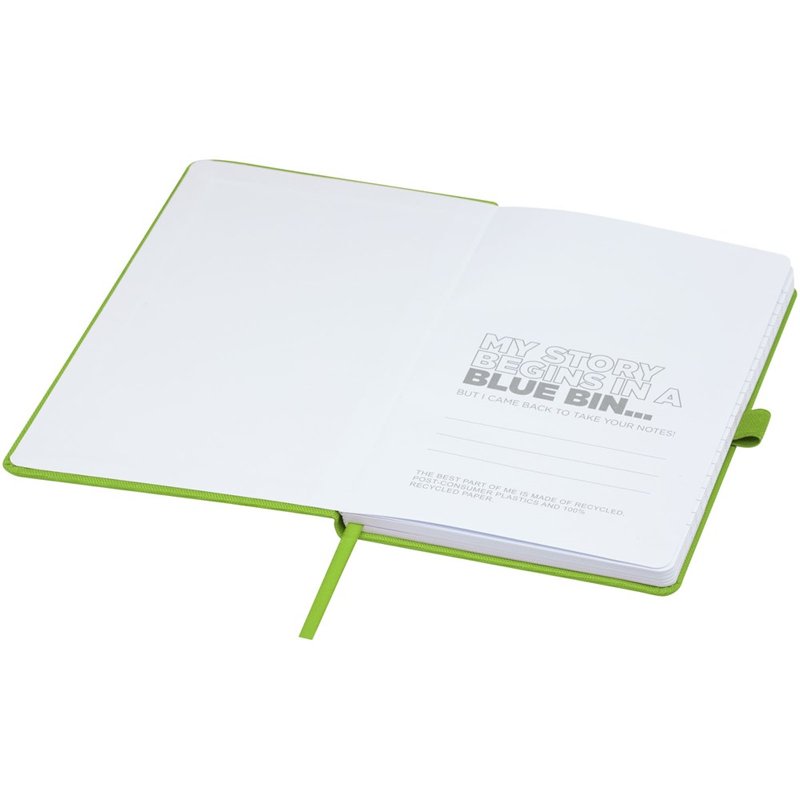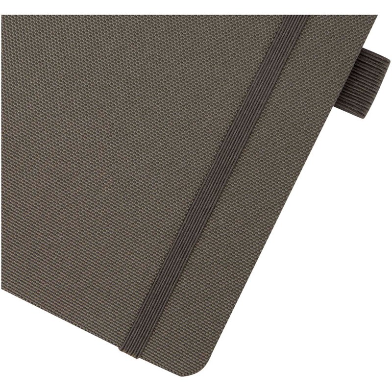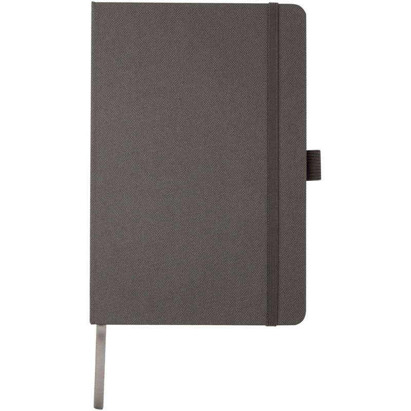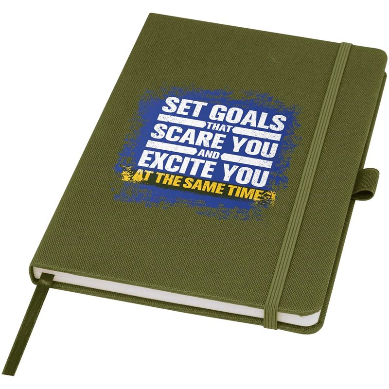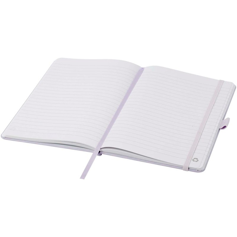 Notitieboek in A5-formaat met cover van RPET-stof. Bevat 80 vellen 70 g/m² gerecycled papier met gelijnde lay-out, een pennenlus en lint. Te combineren met de 107757 Honua RPET-balpen.