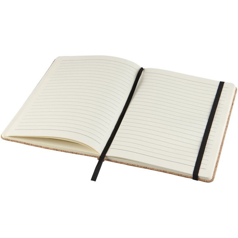 Een A5-formaat notitieboek met kurken omslag, zwart elastiek en bladwijzer. Bevat 80 bladen van 70 g/m2 lijntjespapier.