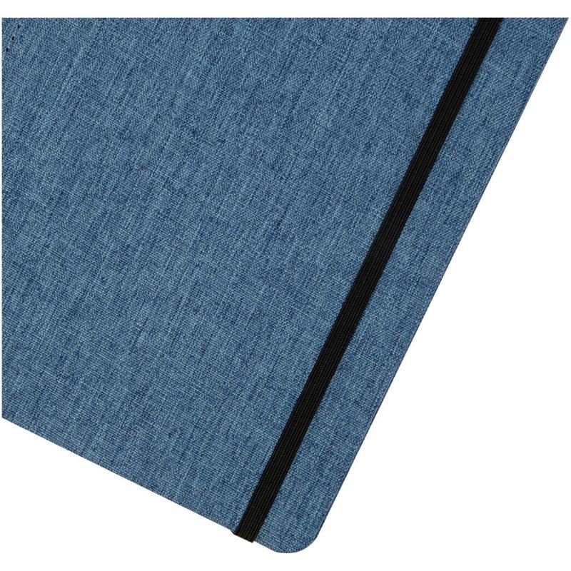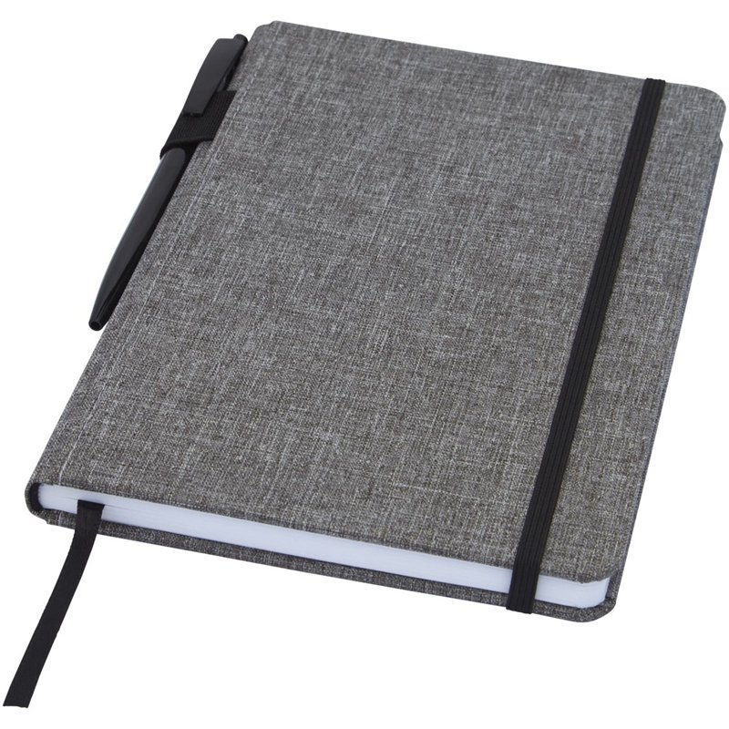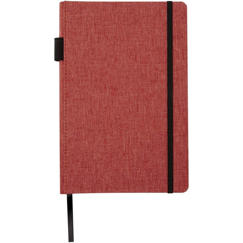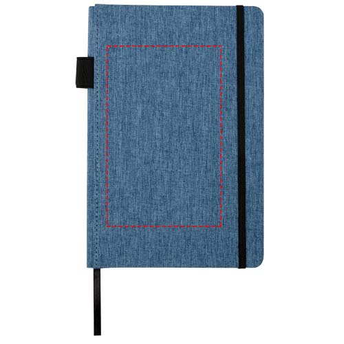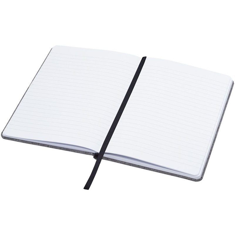 Notitieboek in A5 formaat met cover gemaakt van RPET-stof. Bevat 96 vellen 70 g/m² gerecycled papier met gelijnde lay-out, een penlus en lint. Verpakt in een kartonnen hoes.