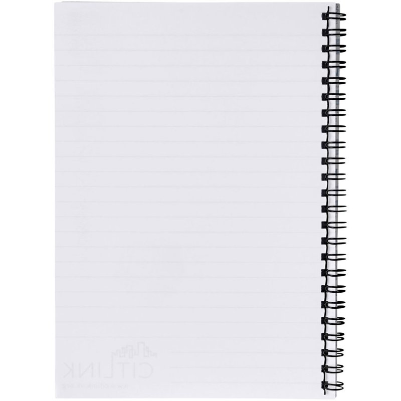 Desk-Mate® spiraal A4 notitieboek. Dit notitieboek bevat een witte of zwarte draad, een glanzende kartonnen omslag (250g/m2) en blanco papier (80g/m2). Standaard geleverd met 50 vel, ook leverbaar met 80 vel. Full colour bedrukking mogelijk op de omslag en elk vel.
