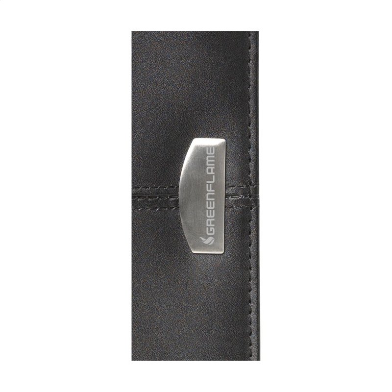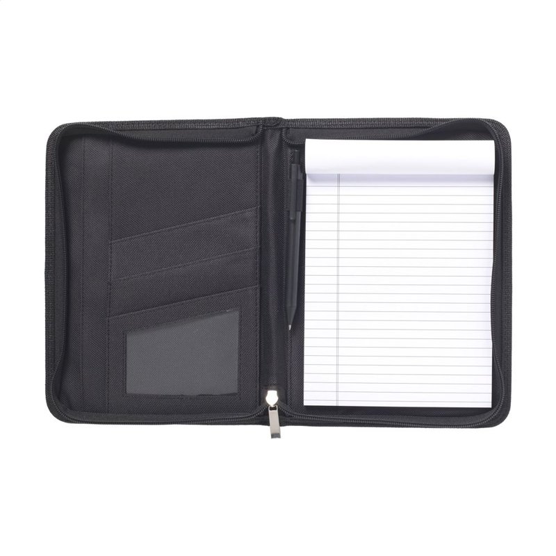Schrijfmap/documentenmap van fijn gebonden leder, in A5-formaat. Met diverse insteekvakken en rits rondom. Incl. schrijfblok en balpen. Per stuk in luxe geschenkdoos.