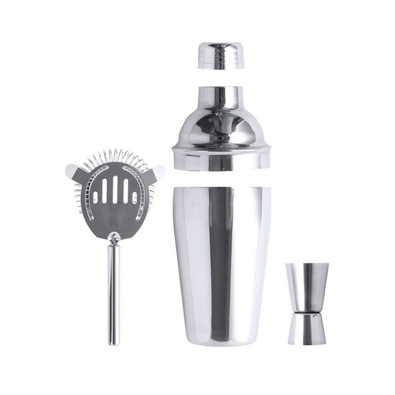 Cocktail set met 3 accessoires, gemaakt van roestvrij staal met chromen afwerking. Inclusief: Cocktailshaker van 550ml inhoud, met veiligheidsslot en maatdeksel aan de bovenzijde.Zeefje met handvat.Enkele/dubbele maatbeker. 550 ml. 3 Accessoires