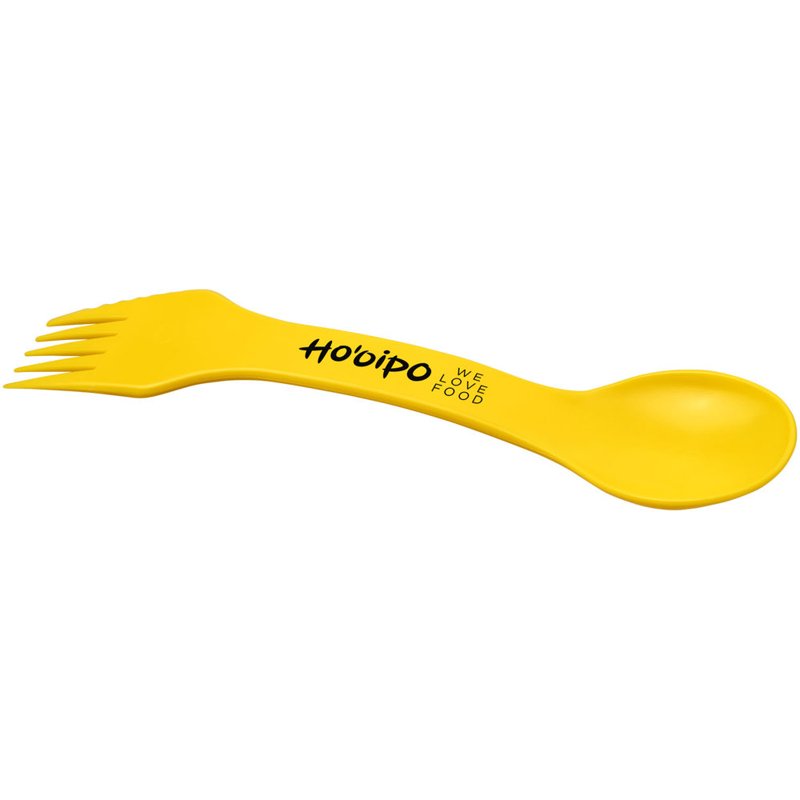 Een gecombineerde vork en lepel met snijvlak die geweldig is voor op de camping, festival of tijdens picknicks en andere buitenactiviteiten.