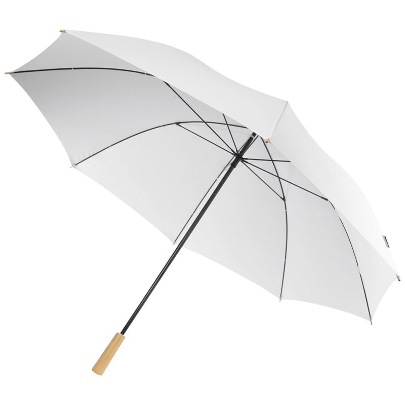 Golfparaplu met een canopy van gerecycled PET pongee polyester, geschikt voor 2 personen. De stevige metalen steel en het hoogwaardige frame met fiberglass ribben bieden maximale flexibiliteit bij winderige omstandigheden. Samen met het houten handvat en de punten, evenals de canopy van gerecycled PET pongee polyester, biedt deze paraplu een duurzamere keuze.