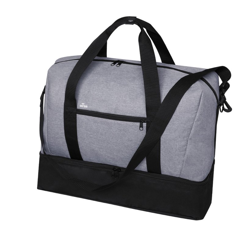 Multifunctionele tas in resistent denim polyester 600D. Stedelijk ontwerp, inclusief RFID-zakje (Radio Frequency Identification) beveiligingstechnologie die de kaartgegevens veilig bewaart. Ritssluitingscompartiment voor schoeisel en zijvak met ritssluiting. Hoofdcompartiment met dubbele ritssluiting en versterkte draaggrepen, met knoopsluiting. Nylon riem versterking rond het lichaam en verstelbare schouderband.