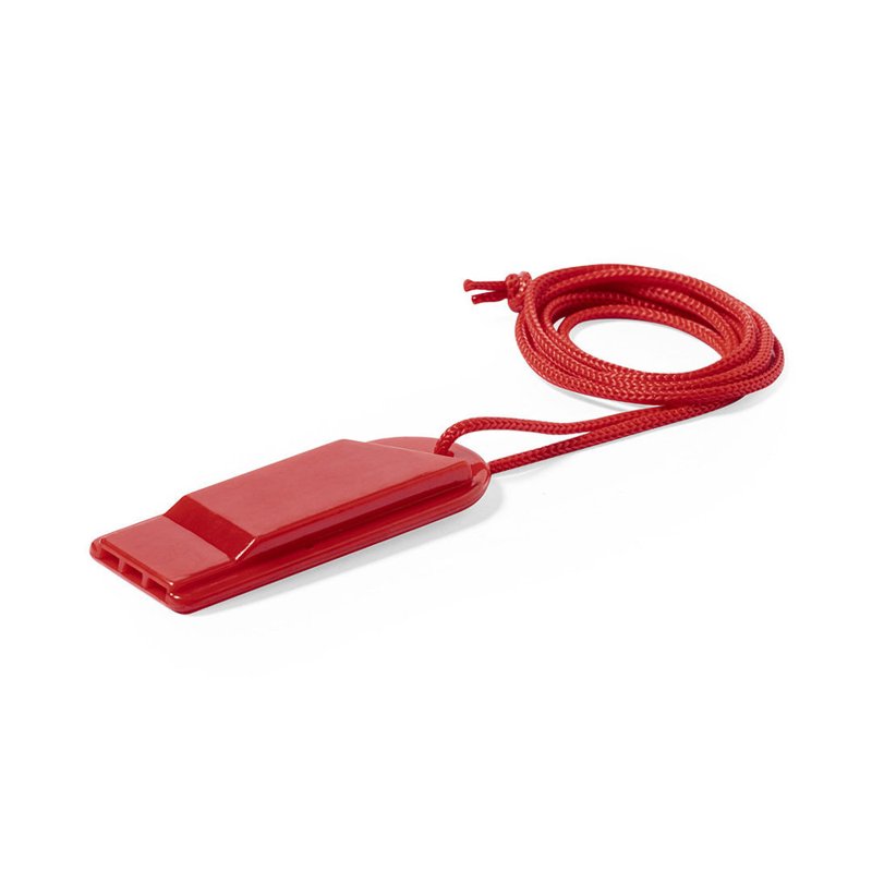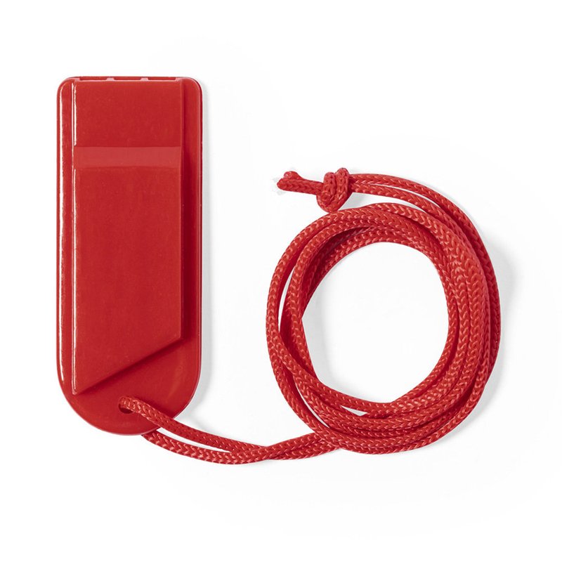 Fluitje met opvallend design en gemaakt van duurzaam PS. Met bijpassende kleur halskoord en verkrijgbaar in een groot aantal kleuren.