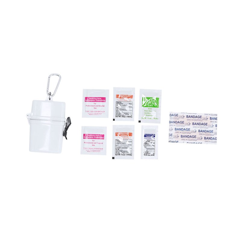 Excursiekit met 8 accessoires gepresenteerd in een stevige ABS-case, met een handige metalen karabijnhaak voor eenvoudig vervoer. Inclusief een handdoek voor handen wassen, een insectenbeet verzachtende doek, zonnebescherming SPF30, aftersun, handgel en verbanden.