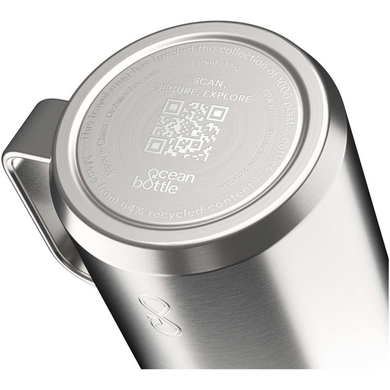 De Ocean Bottle reismok van 350 ml heeft dubbelwandige isolatie om dranken tot vier uur warm en tot tien uur koud te houden. Met de ergonomische handgreep kun je het aan tassen of andere voorwerpen bevestigen om de opslagruimte en draagcapaciteit te optimaliseren. Elke reismok is volledig CO2-neuttraal en bestaat uit 1000 plastic flessen om het leefklimaat in kustgemeenschappen te verbeteren. De mok is gemaakt van 90% gerecycled roestvrij staal en andere gerecyclede materialen. Gepresenteerd in een verantwoord geproduceerde, gerecyclede kartonnen geschenkverpakking.