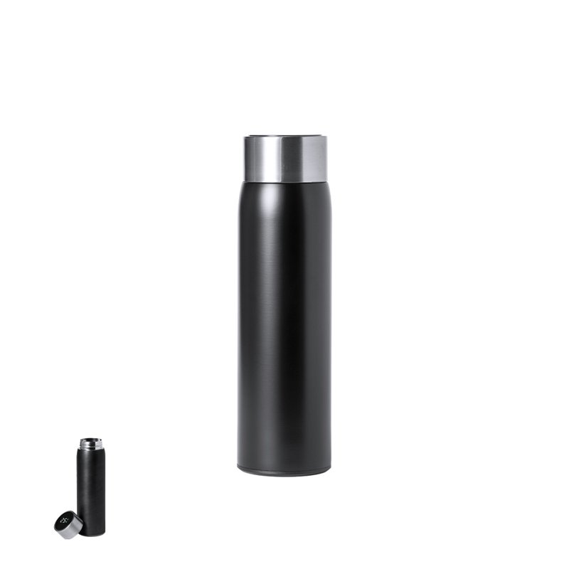 Dubbelwandige thermische fles van roestvrij staal, met een aanraakgevoelige temperatuurmeter geïntegreerd in het deksel. Inhoud van 500 ml en matte afwerking. Met BPA-vrij veiligheidsdeksel en gepresenteerd in een aantrekkelijke designdoos. Werkt op batterijen (knoopcel inbegrepen) en gebruiksaanwijzing beschikbaar in het Engels en Spaans. 500 ml. Touch Temperatuurweergave. Knoopcel Batterij Inclusief