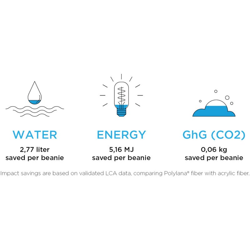 Duurzame promotionele beanie. Enkellaags beanie met dubbel gevouwen rand. Luslabel met merknaam. Polylana®-vezel is het low-impact alternatief voor 100% acryl- en wolvezels, waardoor water en energie wordt bespaard en de CO2-uitstoot tijdens het productie- en verfproces wordt verminderd. In vergelijking met acrylvezel levert elke muts van Polylana® de volgende besparing op: 2,77 liter water, 5,16 MJ energie en 0,06 kg GhG (CO2). De besparingen zijn gebaseerd op gevalideerde gegevens van de levenscyclusanalyse (LCA).